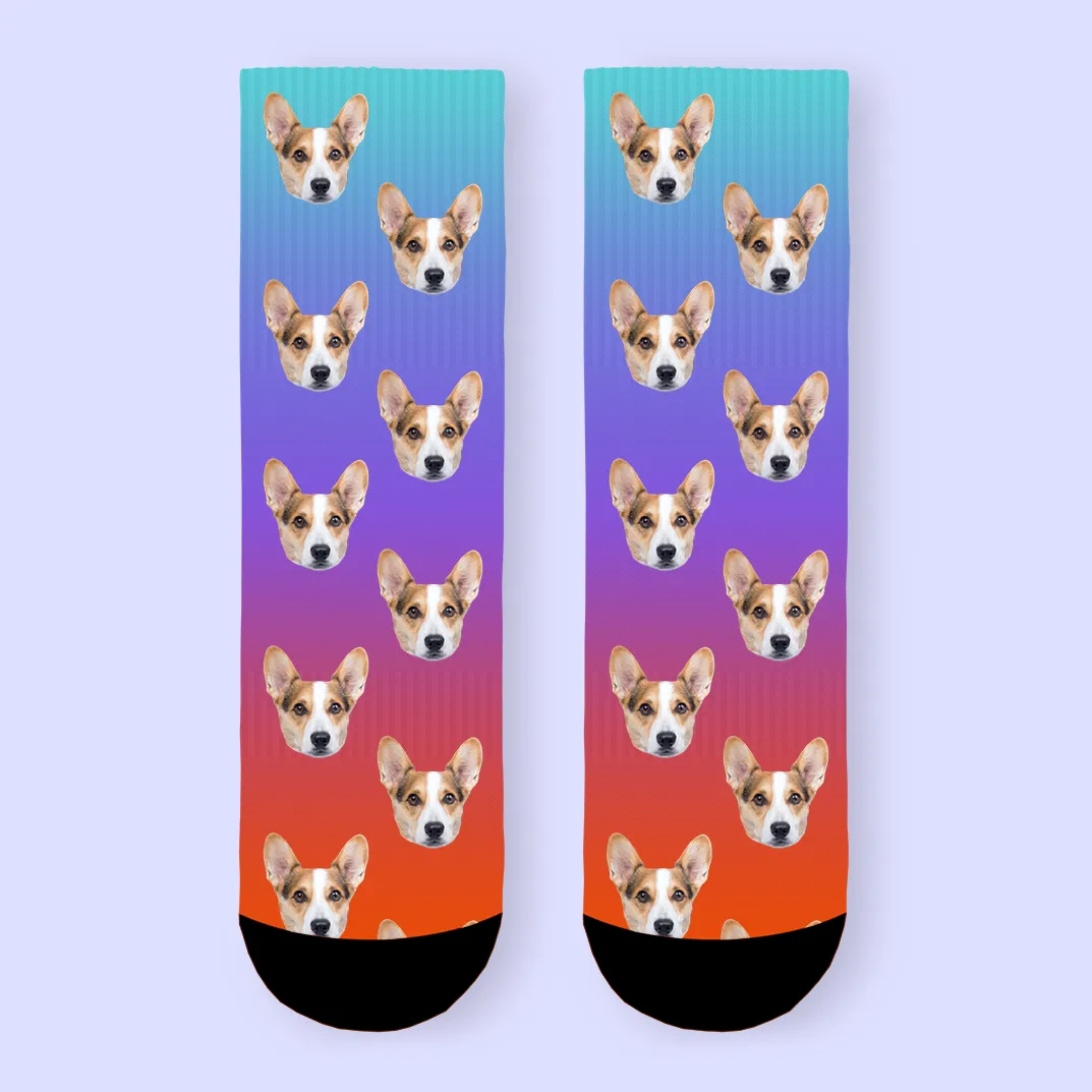 A photo of a dog with personalized socks featuring its face on a pink background.